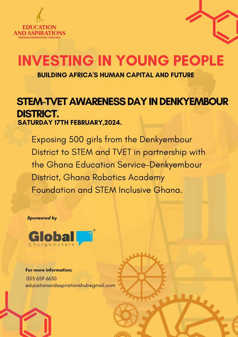 Education and Aspirations Hub is organizing a Science, Technology, Engineering and Mathematics (STEM) and Technical and Vocational Education and Training (TVET) Awareness Day for 500 girls from Denkyembour District. Support this initiative by making a kind donation today with a simple click on our donation button. Your contribution will inspire these young minds for positive transformation.