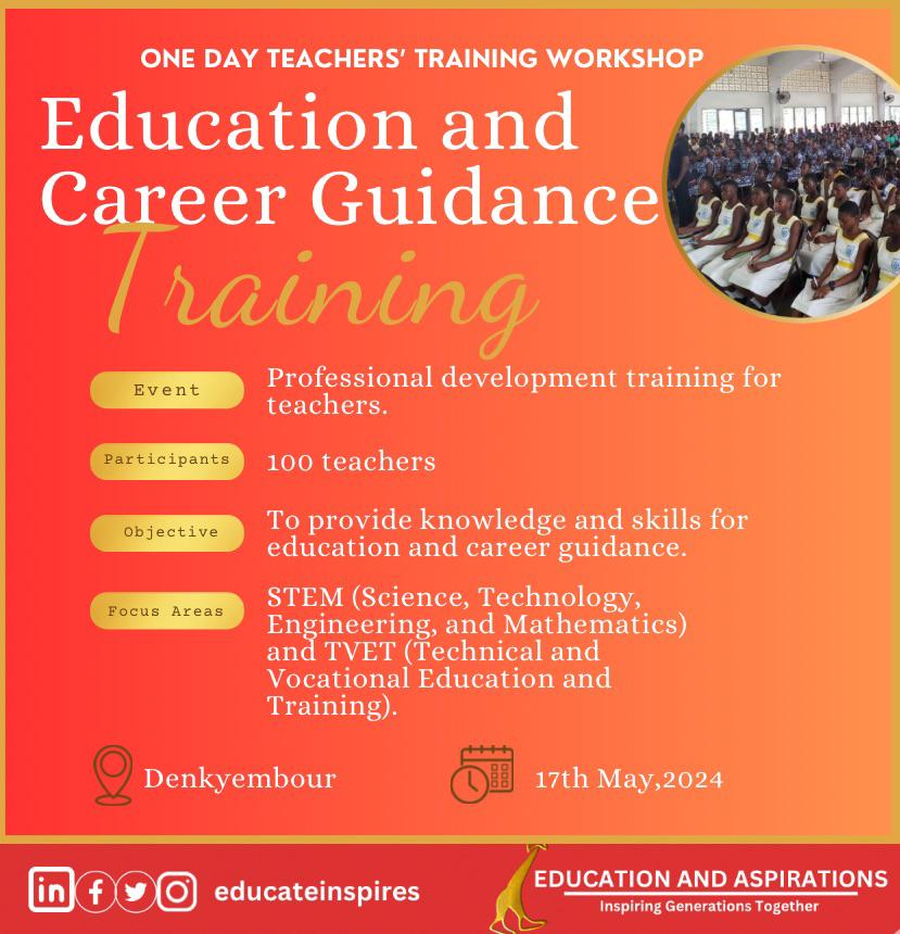 Education and Aspirations Hub is thrilled to announce our latest professional development training in Denkyembour district! This ground breaking event unites 100 educators to enhance their skills in STEM TVET. and to cultivate effective career guidance in schools. Let’s transform education and inspire the next generation!